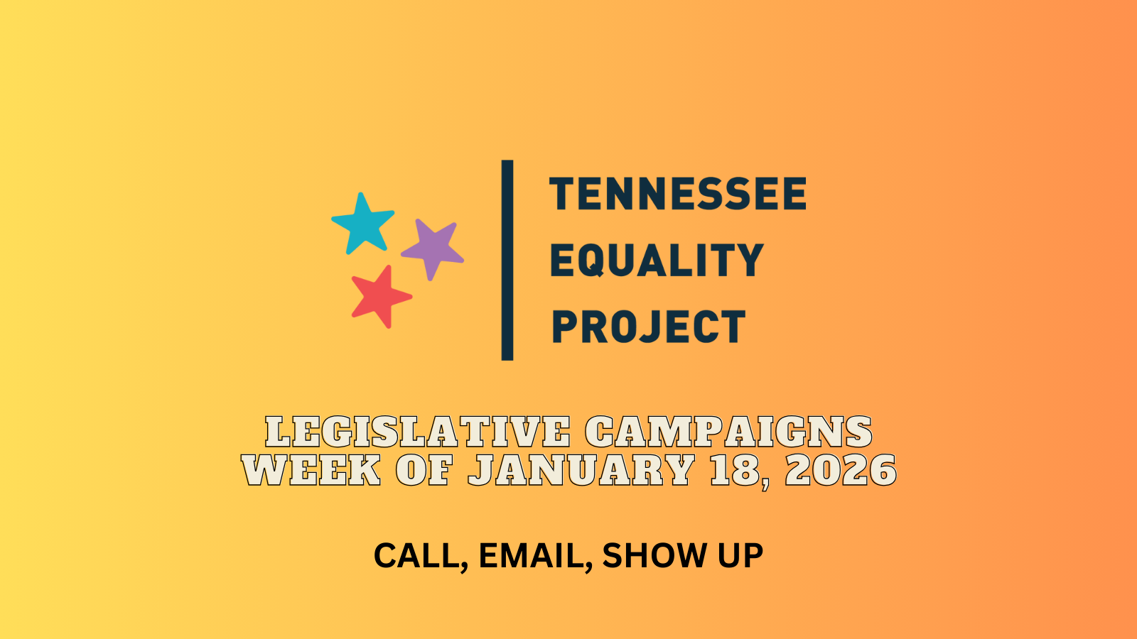 Calls on HB1271: This bill says the public policy of Tennessee is that there are only two sexes. It is up for a vote on January 21 in the House Judiciary Committee at Noon Central Time. Its amendment from 2025 imposes this view in a sweeping way on local governments in Tennessee. Use the numbers and the scripts at the link to leave phone messages with members of the committee urging them to vote NO on the bill. If you prefer not to reach a live person, we recommend calling in the evening and on the weekend when legislators and their staff are typically not in the office.